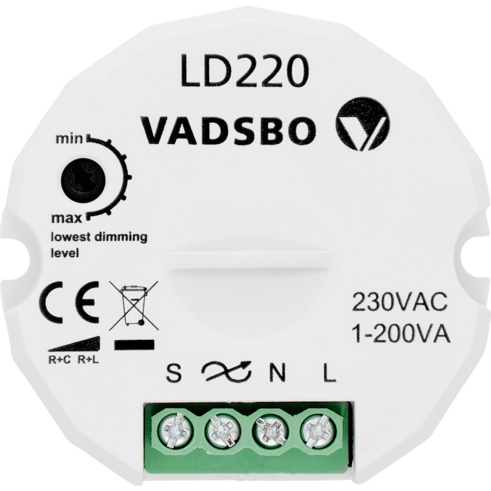 Das Besondere des VADSBO LD220 Tastdimm-Moduls ist seine universelle Einsetzbarkeit, die durch den großen Leistungsbereich von 1 bis 200 Watt für alle aufgeführten Lichtquellen erreicht wird. Der LD220 sorgt zudem für einen Dimmbereich von 0-100% - auch bei LED-Lichtquellen! Ermöglicht wird dies durch eine in Schweden entwickelten & feinabgestimmte Dimm-Technologie, sowie die Möglichkeit das Min-Level mittels eines Reglers am Dimmer individuell einzustellen. Der LD220 kann mit einem oder mehreren handelsüblichen Tastschaltern angesteuert werden.