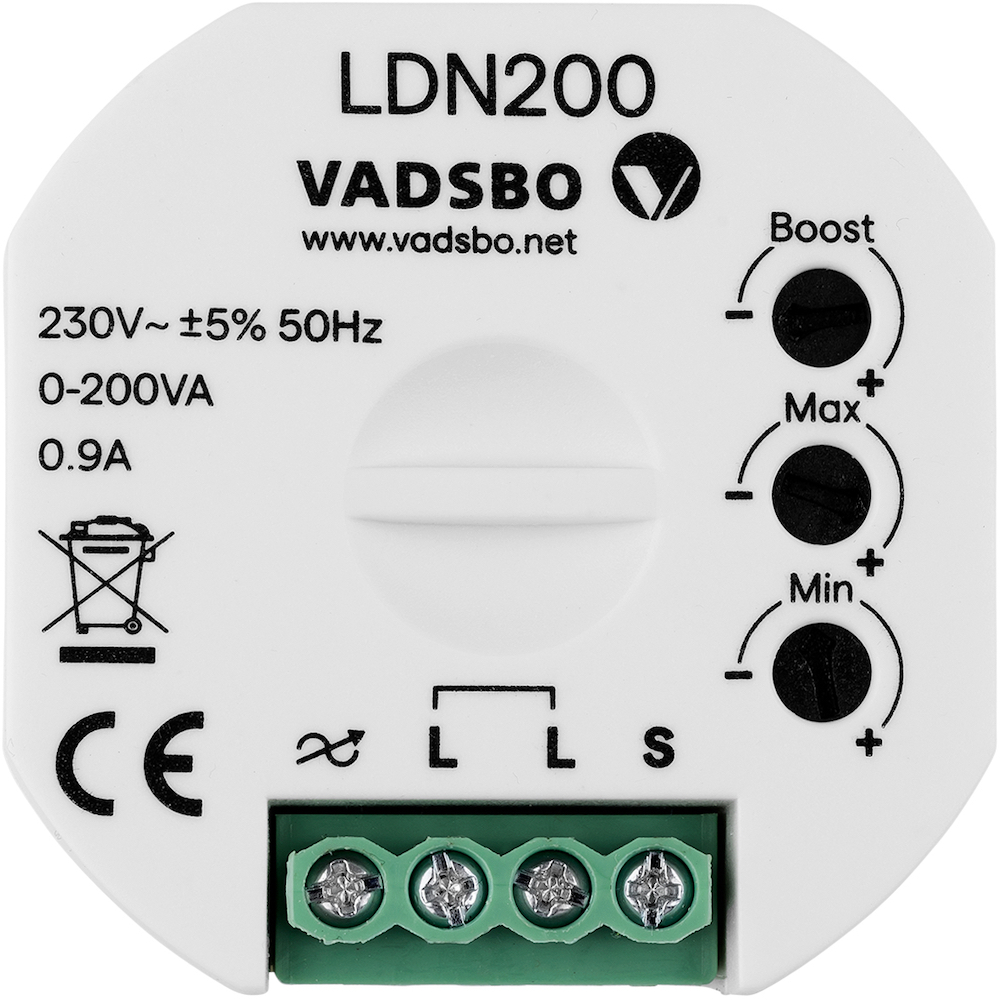Das LDN200 ist ein Tastdimm-Modul das für den Anschluss keinen Neutralleiter benötigt. Daher ist das LDN200 optimal für Anschlussdosen oder anderer schwer zugänglicher Installationsumgebungen geeignet in denen kein Neutrallleiter vorhanden ist. Das Tastdimm-Modul kann über einen oder mehrere Taster gesteuert werden. Das LDN200 hat eine Memory-Funktion und behält beim Ein- / Ausschalten die zuletzt eingestellte Lichtstärke bei, dies gilt auch wenn der Dimmer stromlos war. Zudem bietet das LDN200 eine Minimum- und Maximum-Einstellmöglichkeit sowie eine Boost-Funktion.